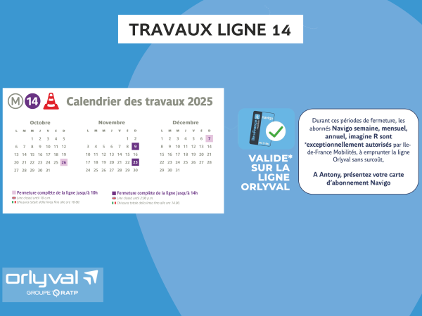 En raison de travaux sur la ligne 14, les abonnements Navigo sont exceptionnellement autorisés, par Ile-de-France Mobilités, sur la ligne Orlyval le 23 novembre 2025 de 6h00 à 14h00 .