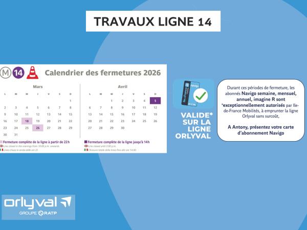 En raison de travaux sur la ligne 14, les abonnements Navigo sont exceptionnellement autorisés, par Ile-de-France Mobilités, sur la ligne Orlyval le 26 mars 2026 de 22h00 à 23h35 dernier départ.